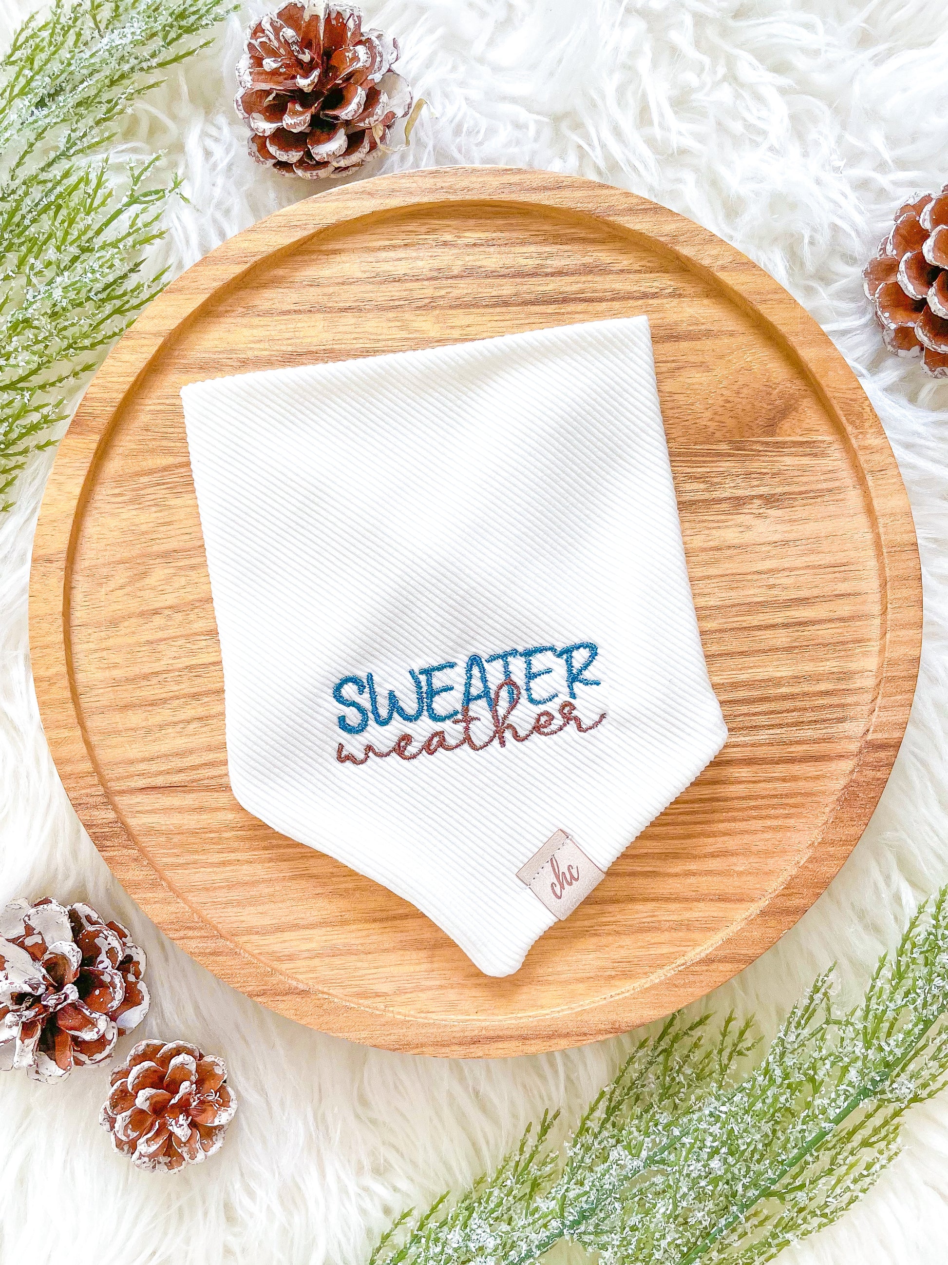 Features the phrase βsweater weatherβ in your thread combination of choice